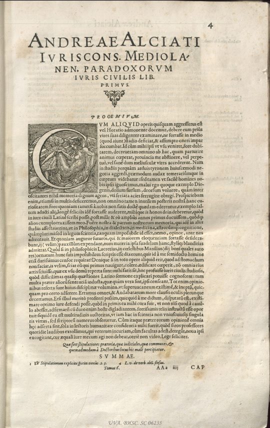 El considerado como padre de la literatura emblemática Andrea Alciato (1492–1550), contó con una gran fortuna editorial. Casi todos tus textos fueron reimpresos en diferentes ocasiones. Una de ellas es la edición titulada Tractatus, orationes, adnotationes in C. Tacitum et emblemata… Tomi sexti, pars unica, publicada en Basilea en 1560,