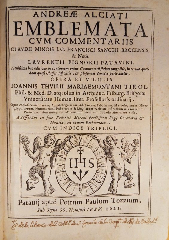 Debemos destacar como en ella se incluye la aportación de otro de los más importantes comentaristas de Alciato, junto a los citados en otros libros de la biblioteca de Santa Cruz, Lorenzo Pignoria (1571-1631), que ya había sido publicado en Padua en 1618. Sacerdote paduano y anticuario, a él se debe la actualización del comentario, con una orientación más antiquaria y simbólica, que amplía la lectura moral del emblema hacia el terreno de la arqueología y la historia de los símbolos. Su método, basado en la comparación entre los emblemas de Alciato y los jeroglíficos egipcios o monedas antiguas, anticipa el enfoque mitográfico del siglo XVII. De este modo, la edición de 1621 se sitúa en la confluencia entre la tradición filológica de Mignault y la curiosidad iconológica que caracterizará a la erudición barroca.