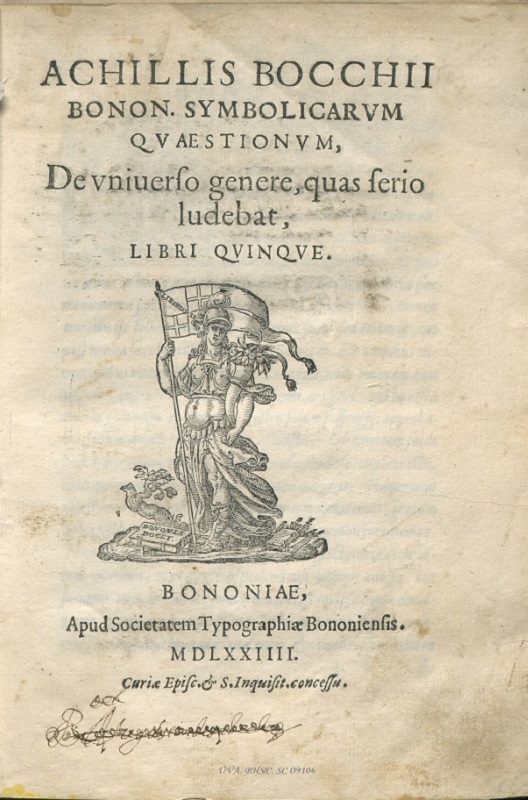 Nacido en Bolonia en el año 1488, Achille Bocchi recibió una educación humanística que le permitió ejercer con tan solo 20 años como profesor de latín y griego y, más tarde, también de retórica y poesía, en la Universidad de Bolonia. En 1508 publicó su primer trabajo filológico, la obra Apologia in Plautum y, en 1512, la traducción al italiano de la Vita di Cicerone escrita por Plutarco. Esta última estuvo dedicada al cardenal Achille Grassi, tío de su mujer, Taddea Grassi, con la que tuvo seis hijos. Además de su vocación humanista, demostró grandes dotes para los negocios y la diplomacia, lo que le llevó a reunir una gran fortuna. Desde 1517, también trabajo en una obra sobre la historia de su ciudad natal por encargo del Senado boloñés. Sin embargo, esta quedó incompleta, por lo que su hijo Pirro se hizo cargo de continuar el trabajo iniciado por su padre.