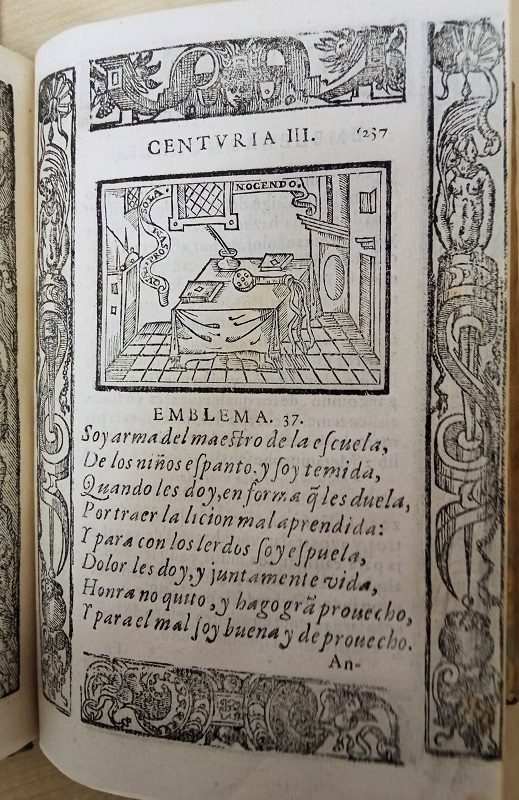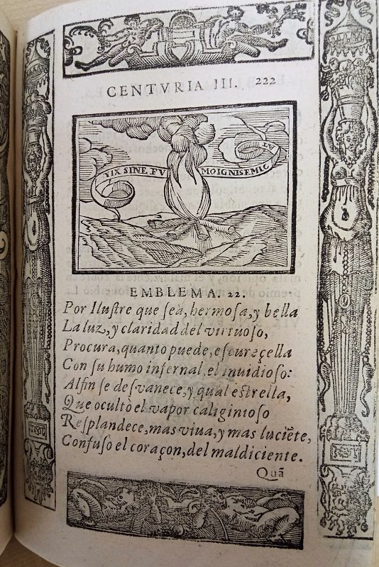 El libro recoge un total de 300 emblemas, agrupados en tres secciones o centurias con 100 empresas cada una. Al final, un índice recoge todos los motes en orden alfabético, con su pertinente numeración dentro del texto. Cada hoja, presenta un emblema en el anverso con su correspondiente mote, inscrito en un pergamino junto a la pictura, y debajo el epigrama. En el reverso, la dedicatoria. Ambos lados, enmarcados por cuatro tacos xilográficos con motivos decorativos de corte clasicista.