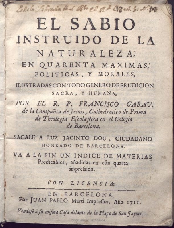 Garau, Francisco (1675). El sabio instruido de la naturaleza: en quarenta máximas políticas y morales. Barcelona: en casa Cormellas por Vicente Suirá.
