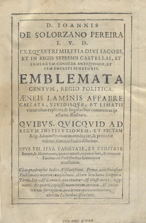 Formado como jurista en Salamanca y oidor de la Audiencia de Lima entre 1609 y 1626, Solórzano Pereira había alcanzado gran renombre con su Política indiana (1647), summa jurídica sobre la administración colonial. El Emblemata puede entenderse como complemento de aquella, pues traduce en claves alegóricas y visuales el ideario político-jurídico que sostenía el gobierno de los reinos hispánicos. Aunque adopta la estructura tradicional de la emblemática —grabado, mote y comentario—, Solórzano desarrolla interpretaciones de enorme amplitud y erudición, transformando cada empresa en un verdadero tratado de filosofía política y derecho público.