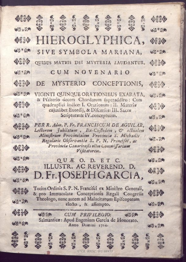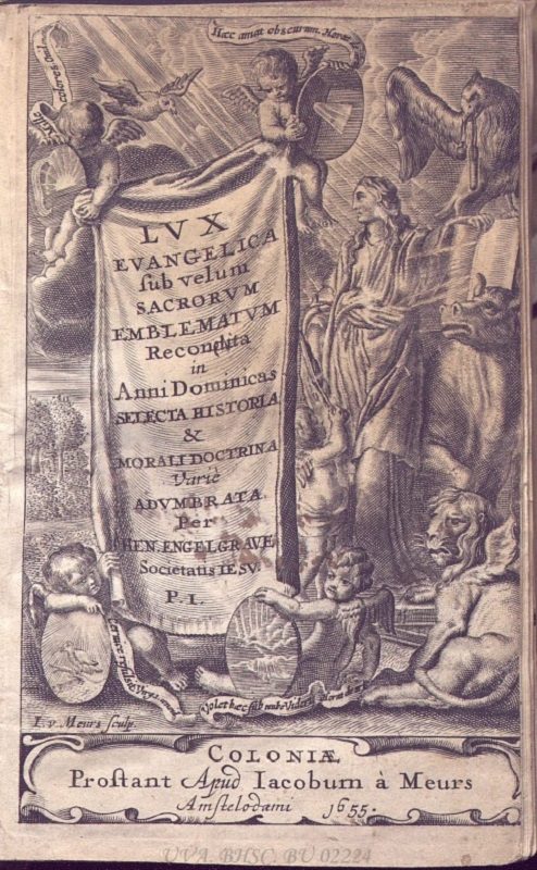 La emblemática sacra trasladó este lenguaje simbólico al ámbito de la fe. Los jesuitas fueron sus grandes cultivadores, al entender que la imagen, correctamente interpretada, podía mover los afectos y conducir a la meditación espiritual. Obras como el Paradisus sponsi et sponsae de Jan David (1607), Lux evangelica de Engelgrave (1655) o el Mater amoris et doloris de Antonius Ginter (1741) son ejemplos paradigmáticos. En el ámbito hispano, libros como Flores de Miraflores (1659) de Fray Nicolás de la Iglesia adaptaron este lenguaje a la devoción mariana, integrando la imagen como vía de contemplación teológica. En todos ellos, el emblema se convierte en instrumento de oración, donde la alegoría sustituye al dogma y la imagen devota enseña a sentir y a creer.