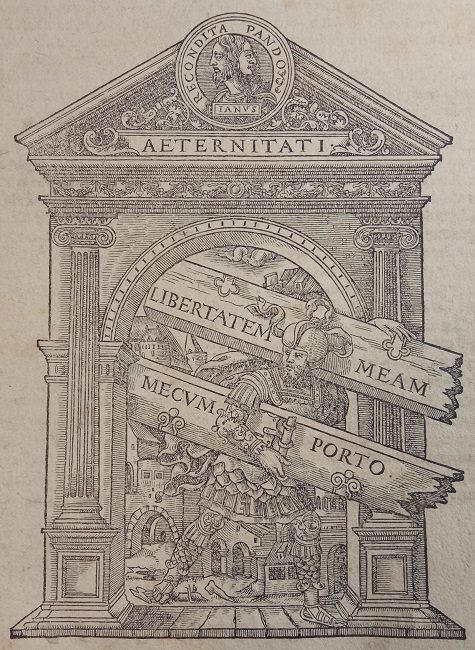 - U/Bc 00768 En portada no aparece la marca de impresor sino más bien la del autor o responsable de la traducción. En esta edición realizada por Miguel Servet de la Geografía de Tolomeo: Claudii Ptolomaei Alexandrini Geographicae enarrationis, libri octo (Lugduni: Apud Hugonem a Porta, 1541), se representa a Sansón arrancando las puertas de Gaza, en ellas figura «Libertatem meam mecum porto». Todo en arco arquitectónico laterales de columnas, dintel y tímpano; en el un medallón de Jano rodeado por las palabras RECONDITA PANDO y abajo una cartela Aeternitati.