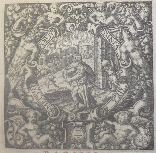 Buon, Nicolas – Francia (Paris) – 1616 – «Omnia mea mecum porto». En la marca de Gabriel y de Nicolas Buon (entre otros), libreros impresores parisinos y de su Universidad, se repite con variaciones el motivo de Bias, uno de los sabios de Grecia, escapando de la la ciudad de Priene.