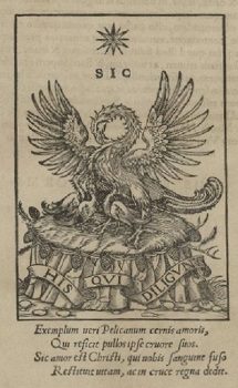 - U/Bc IyR 0325. Pelícano, símbolo eucarístico, en la marca de la oficina tipográfica de Franz Behen, Maguncia, 1549 en los Comentarios de Johannes Cochlaeus (1479-1552) humanista y famoso polemista contra Lutero, sus escritos y pensamiento político-religioso.